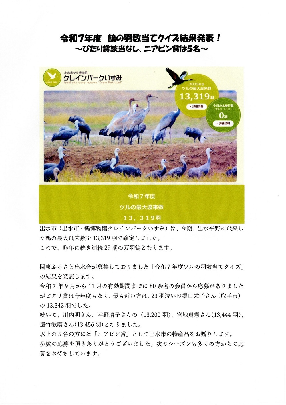 関東ふるさと出水会が募集していた「令和5年度ツルの飛来羽数当てクイズ」の結果を発表します。 令和5年9月から11月まで会員90名余から応募があり、最も近い方は、高畠佑子さん(藤沢市)の13,050羽でした。