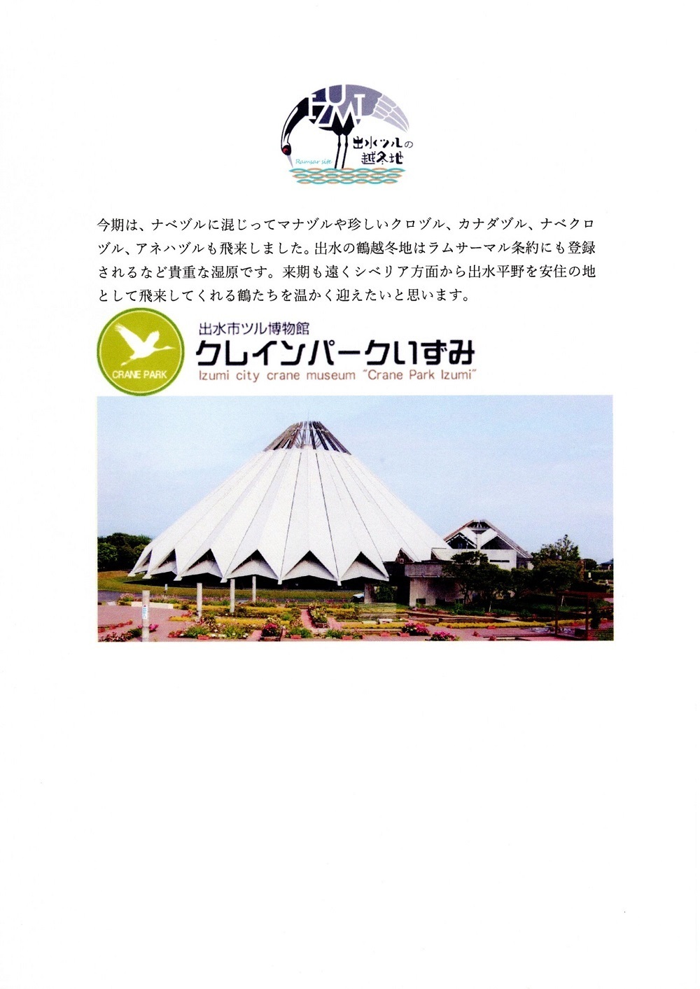 今期は、全国的に鳥インフルエンザが流行し残念ながら出水市でも数次にわたって感染が確認され多くの鶏が殺処分を余儀なくされました。飛来した鶴もその犠牲になってしまいました。遠くシベリア方面から出水を安住の地として飛来してくれた鶴たちにゴメンネの気持ちです。